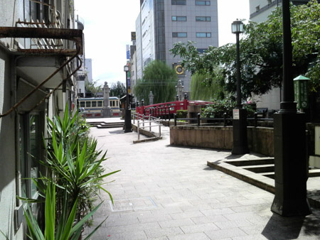 ホテルまで帰ってきました。あれが「はりまや橋」。向こうに通過中なのが「路面電車」。