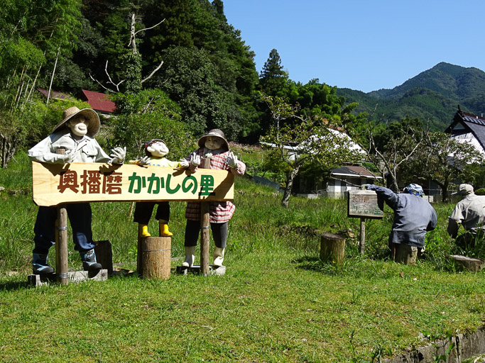 着きました(^^)「奥播磨かかしの里」です。クルマで村の中に入っていくと・・・至る所にかかしの村人さんが・・・。これ以降、写っている人物はウチの娘以外全部かかしさんです。