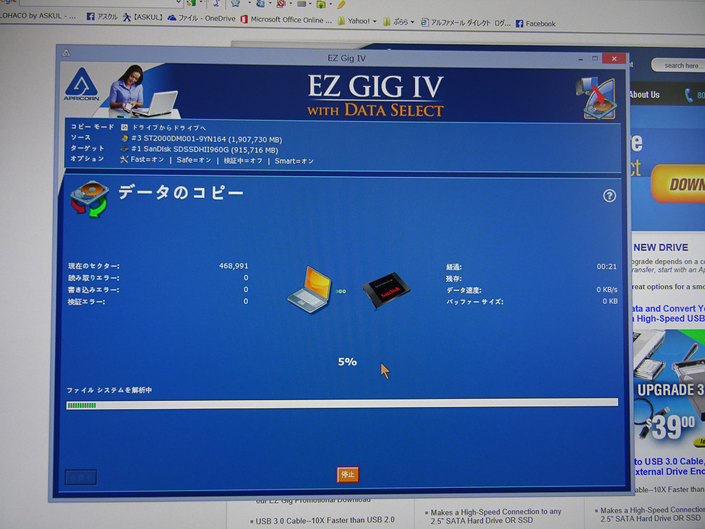メーカーサイトでダウンローしたクローン作製ソフトでHDからSSDに丸ごとデータをコピーしています。2000GB→960GBには当然入りきれないので、一時的にファイルを削除するのに時間がかかりました。