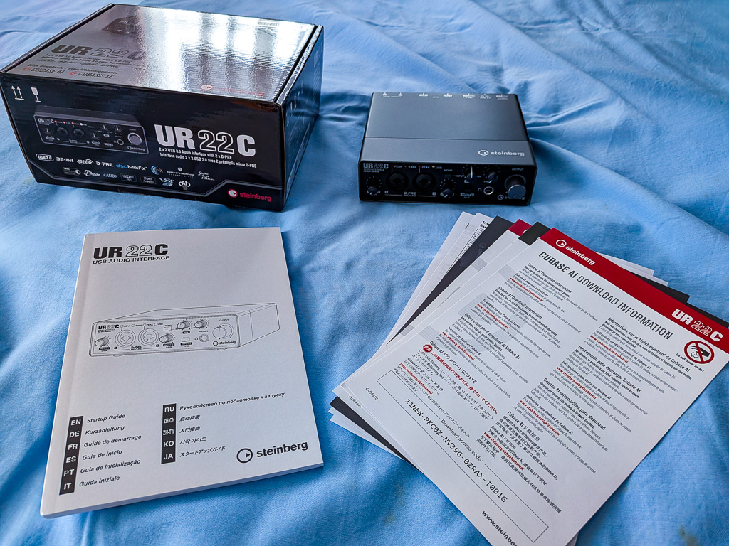 入っていた物。あ、写真に写ってないけど「USBケーブル: USB Type-A to Type-C ケーブル(1本)」も入っていました。それから、(使わないけど)ダウンロードアクセスコード:Cubase AI (DAWソフトウェア)、Cubasis LE (iPad用DAW)、Basic FX Suite (DSPエフェクト)取扱説明書、 スタートガイド、保証書 とか。